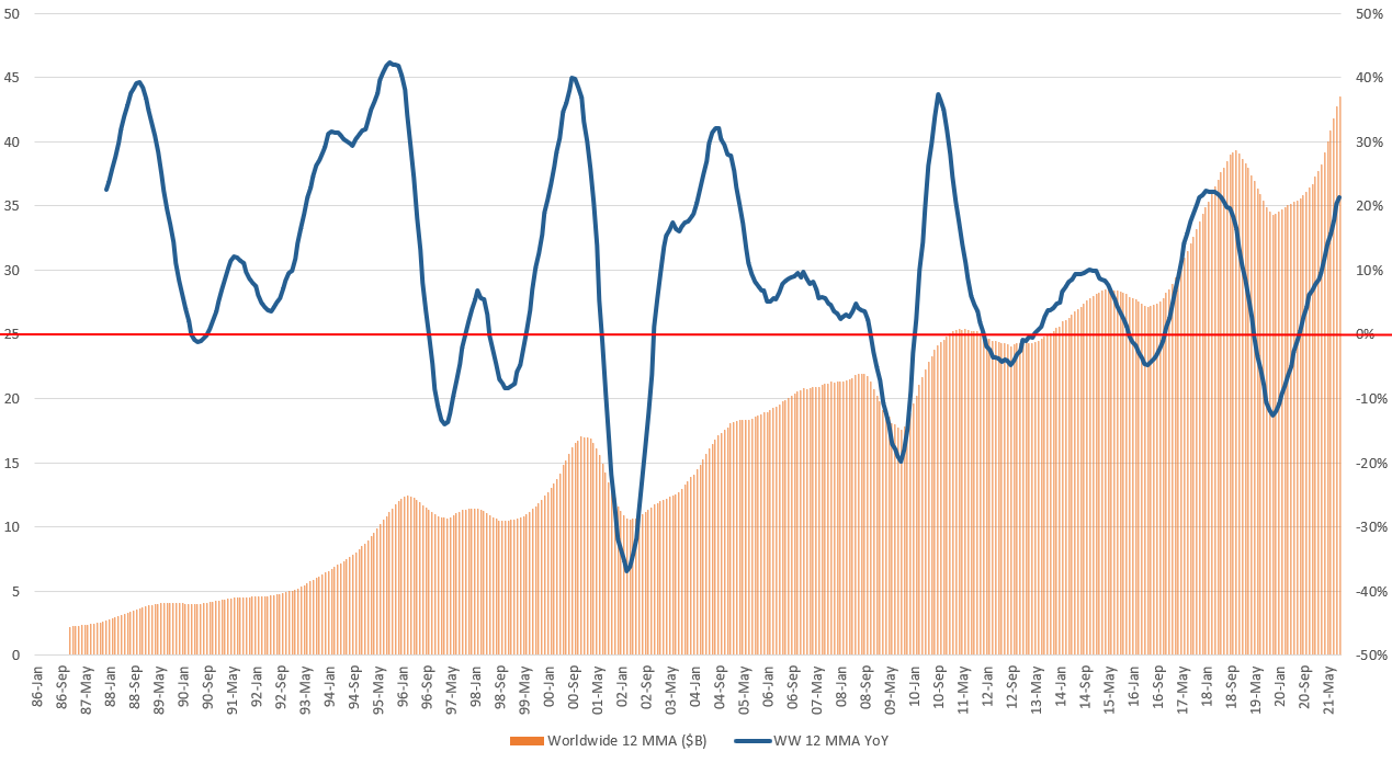去年疫情初期,3月9号的一篇文章“这是最坏的时代,也是最好的时代”,准确「估」计了这一波半导体的「牛」周期。今年6月11日发表的“半导体需求‘猜’测‘猜’测”文章「猜」测这一波上周期会到今年九月到顶。这里先更新一下截至今年九月为止的数据和图表。真的到顶吗?相信有不少行业朋友在个别产品和应用已经看到比较明显的市场转向了。