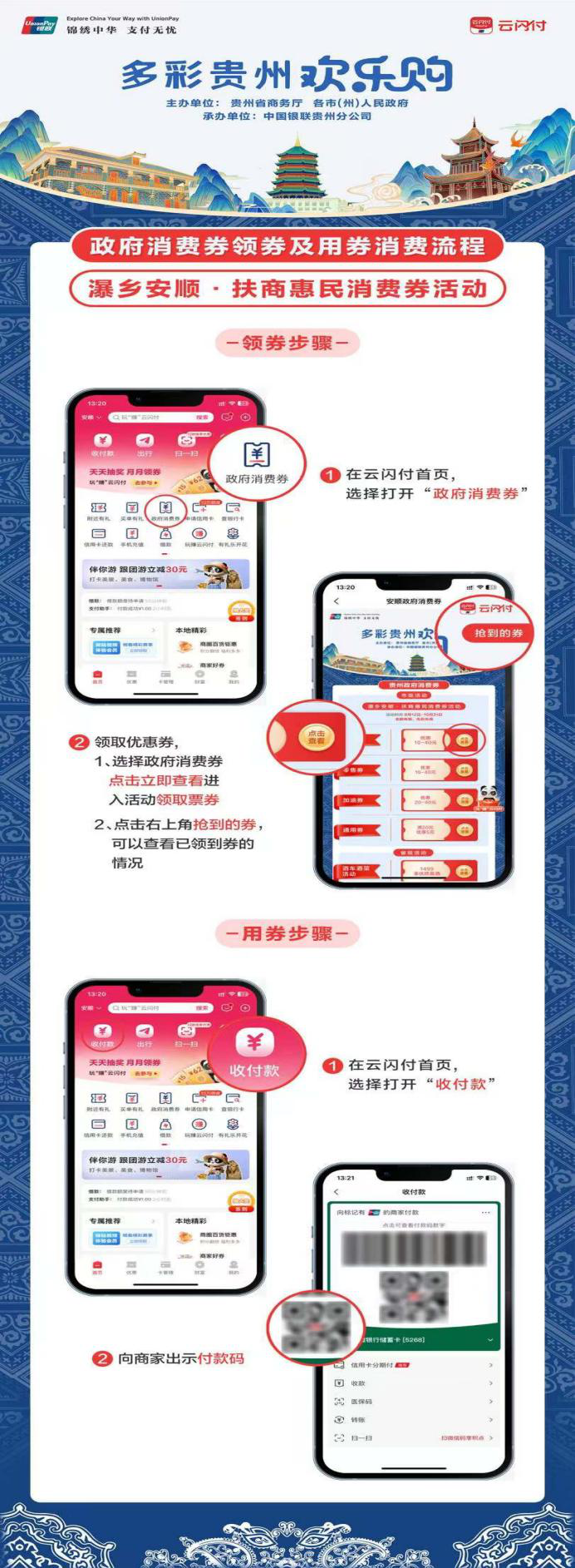 本次普惠消费券发放活动以“瀑乡安顺·扶商惠民”为主题,将持续到10月末,采用电子消费券方式通过银联云闪付APP分批次发放,将于10月1日上午10点整启动。