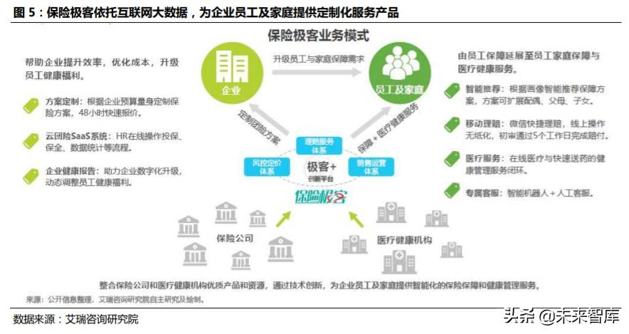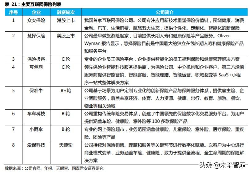 保险科技类企业聚焦于面向特定场景与人群的保险产品定制,数字生态 类保险科技企业处于发展初期,发展潜力较大。 如基于场景需求与保险 公司联合进行产品设计的保准牛;依据用户画像定制保险产品的小雨伞; 提供企业团险、补充医疗服务的保险极客。保险企业在产业链数字化的 基础上,连接不同场景与服务提供的全方位保险服务,并逐渐成长为价 值链整合型的生态企业,例如众安保险、保险极客等。众安在线(6060.HK) 是中国首家互联网保险公司,由“保险+科技”驱动,专注于应用新技术 重塑保险价值链,围绕健康、消费金融、汽车、生活消费、航旅五大生 态,提供个性化、定制化、智能化的新保险。保险极客(C 轮融资)依 托于互联网大数据,重塑传统保险公司的产品设计、定价方式及承保风 控模式,为企业员工及家庭量身定制保障方案,公司还与医疗健康机构 开展合作,业务延伸至健康管理和医疗服务,实现服务闭环。