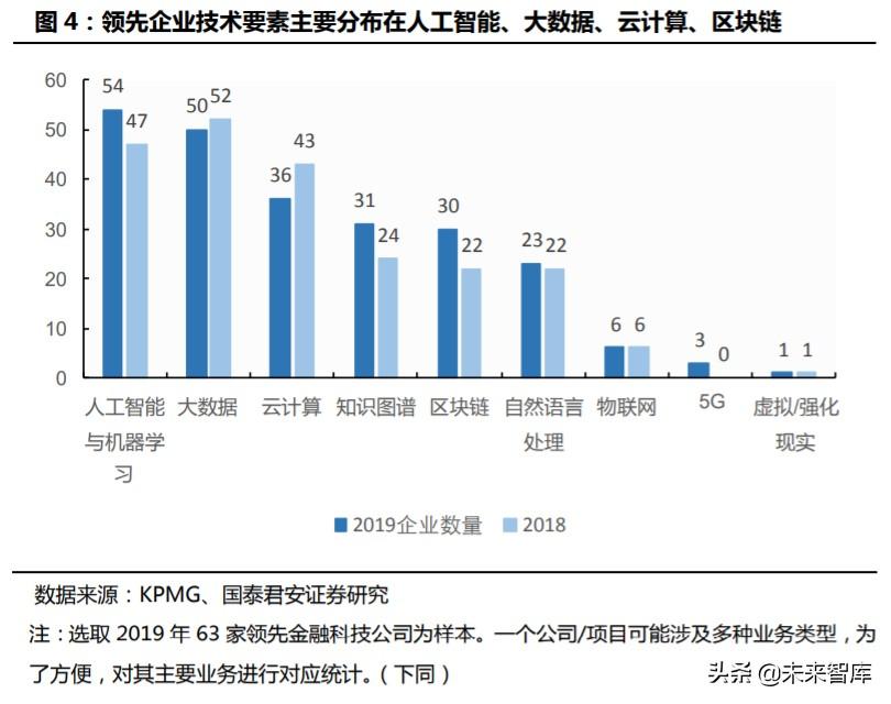 从产业链来看,金融科技企业划可以分为两大类:基础设施类、应用平台 类。 基础设施类企业主要指技术服务商,例如掌握区块链、人工智能等 技术垂直赛道的科技公司。平台层企业主要提供金融科技服务以及金融 科技应用,例如保险科技、数字化信贷、综合性金融科技类企业。根据 KPMG 2019 年 fintech50 的名单,根据专业领域来看,主要集中在证券 财富与资本市场、底层技术、数字化信贷。应用领域中还有保险科技、 综合类、银行科技以及支付领域。主要技术要素主要分布在人工智能与 机器学习、大数据、云计算。