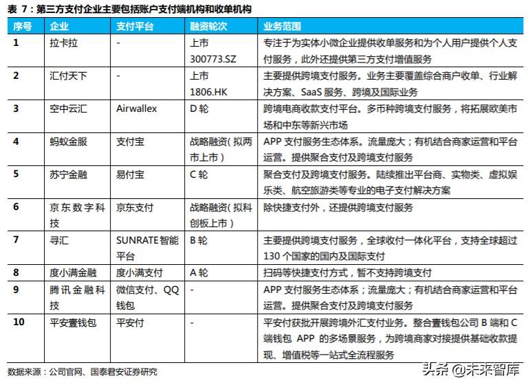 从支付端来看,相关企业包括支付宝(蚂蚁金服)、苏宁支付(苏宁金融)、微信支付(腾讯金融科技)、银联的云闪付等,这些机构业务涵盖了线下 收单、聚合支付及跨境支付服务等场景,支持银行网关支付、银行卡快 捷支付、支付账户余额多种支付方式。从收单环节来看,包括拉卡拉、 汇付天下等,支付产品包括智能 POS 机等终端产品,以及其他支付服务 解决方案,支持线下刷卡、闪付、扫码、无卡、Apple Pay 等支付方式。