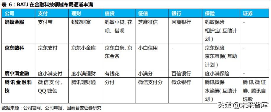 互联网龙头企业通过横向扩展的方式以直接投资致力于扩大业务版图, 同时专注于通过战略联盟,增加其生态系统的价值。 BATJ 中,腾讯金融 科技与蚂蚁金服的业务布局最为全面。京东、度小满正迎头赶上,招银 国际与京东数科合作的招东银行正在筹备中,等待银行牌照发放。