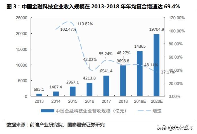 中国金融科技 依 然处于发展初期,企业收入规模在 2013-2018 年年均复 合增速达 69.4%。 根据前瞻产业研究院测算,2018 年,中国金融科技企 业的营收总规模达到 6541 亿元,预计 2020 年达到 19705 亿元。根据易 观智库数据,2018 年中国金融科技市场规模超过 115 万亿元,预计到 2020 年,市场规模将超过 157 万亿元。其中,智能投顾和在线交易平台、 量化交易工具、互联网消费金融和智能风控市场的规模都将是 10 万亿 元级别以上的规模。