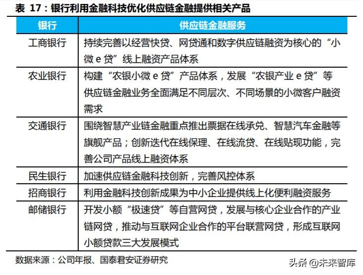 科技赋能供应链金融主要体现在交易场景数据化、供应链条智能化等方 面。金融科技利用广度提升,仍未进入深入应用阶段。 不同于通过优化 风控环节赋能供应链金融,区块链技术有望改变传统供应链金融模式, 让更多小微企业获得贷款。区块链技术实现了电子凭证可拆转融、数据 与业务链上存储执行,使更多链上非核心企业能够获得融资,预计 2023 年市场规模达 6.1 万亿元。2018 年《商务部等 8 部门关于开展供应链创 新与应用试点通知》首次将供应链金融发展上升为国家战略。