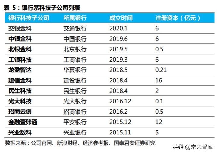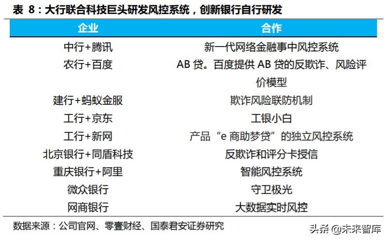 大行联合科技巨头研发,中小银行以外购为主。 部分银行成立子公司开 发智能风控系统并实现技术输出,互联网银行凭借先天技术优势自行研 发风控系统。