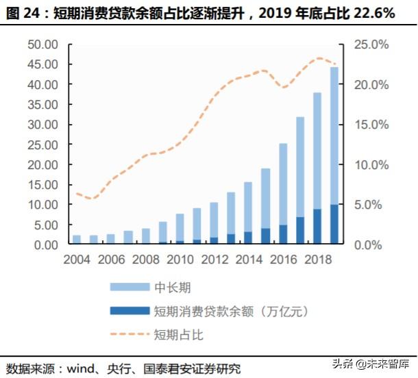 考虑到互联网企业具备更多消费场景,非银行系的机构具备较大潜在发 展空间。 例如以蚂蚁金服旗下的花呗和借呗为代表的产品,截止 2019 年 末真实规模约 1.3 万亿元,与大行的短期消费信贷余额 1.7 万亿元体量 接近。