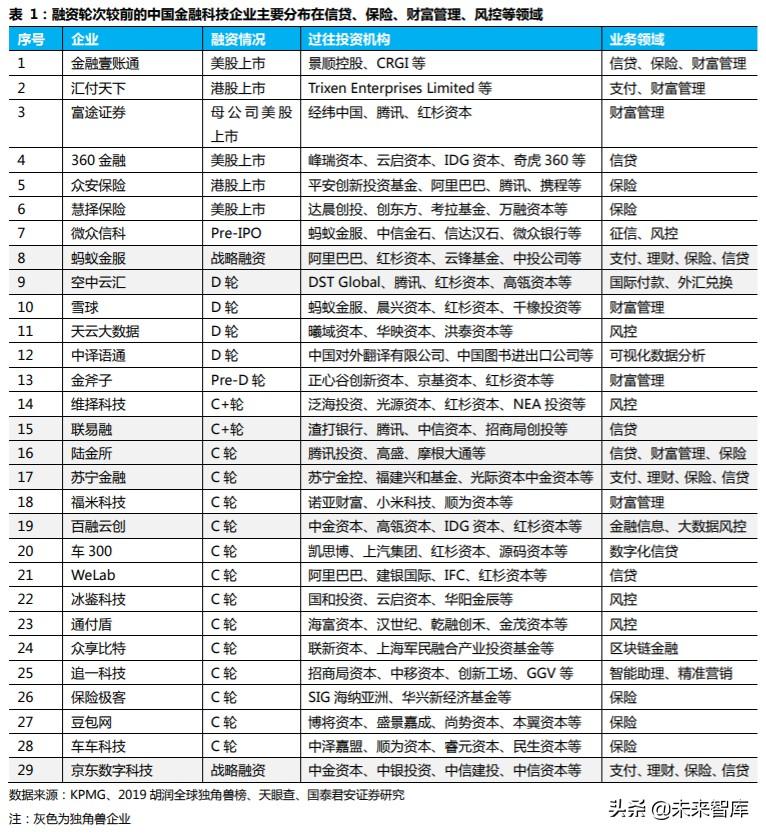 从融资轮次上看,KPMG 公布的 fintech 50 中,保险科技类、数字信贷类企业商业模式相对成熟,企业规模处于持续扩展中。