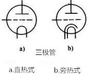 三极电子管 :在二极电子管的阳极和阴极之间靠近阴极的地方加装第三电极g(栅极),就形成了三极管。利用栅极来控制阴极向阳极发射电子的数量。其和晶体三极管的对应关系:阴极相当于发射极,栅极相当于基极,阳极相当于集电极,其电路组成如同晶体三极管基本放大电路,不过栅极加的是负偏压。三极电子管的缺点是极间电容大,放大系数低。