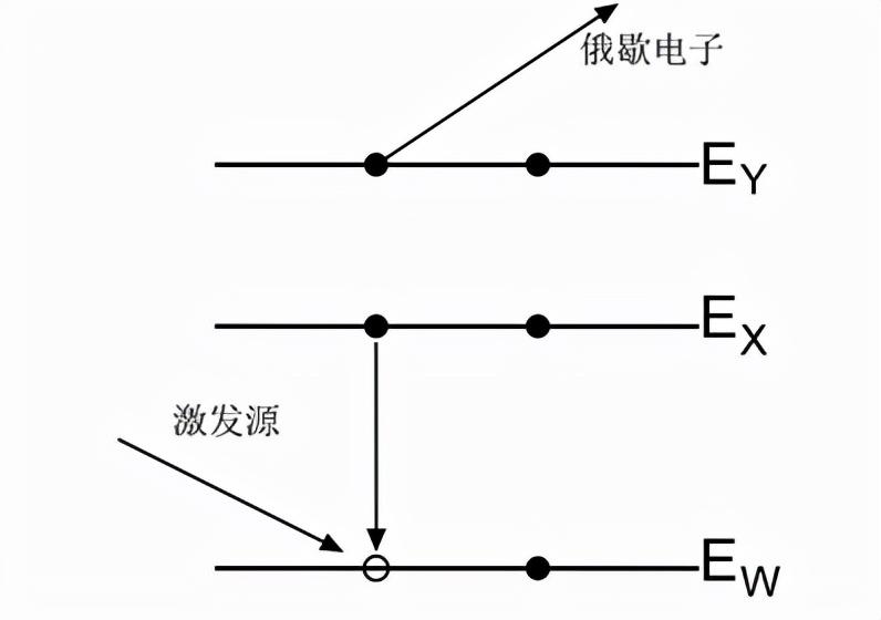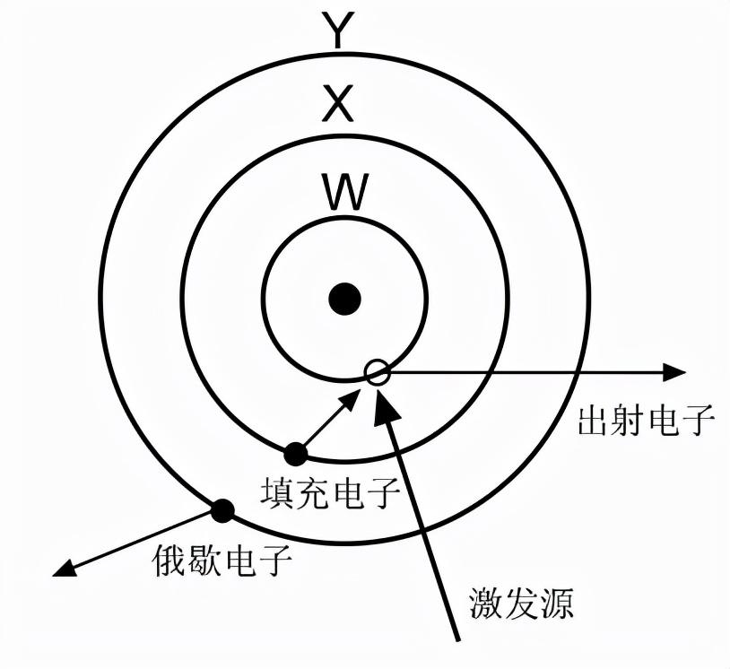 俄歇电子能谱(AES)的原理比较复杂,涉及到三个原子轨道上两个电子的跃迁过程。当具有足够能量的粒子(光子、电子或离子)与一个原子碰撞时,原子内层轨道上的电子被激发出后,在原子的内层轨道上产生一个空穴,形成了激发态正离子。激发态正离子是不稳定的,必须通过退激发而回到稳定态。在退激发过程中,外层轨道的电子可以向该空穴跃迁并释放出能量,并激发同—轨道层或更外层轨道的电子使之电离而逃离样品表面,这种出射电子就是俄歇电子。