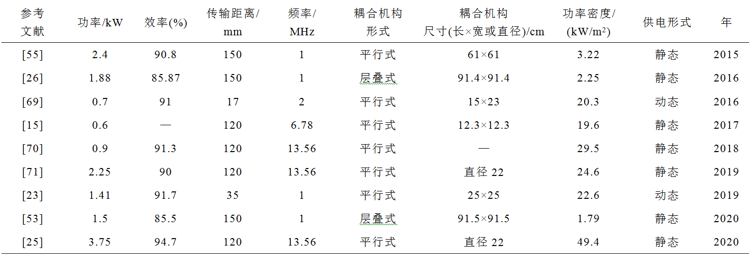 目前,国内外研究团队围绕功率密度提升、静态/动态供电、抗耦合机构偏移、降低参数敏感性等多方面进行了研究。