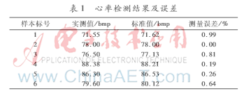 表1为6例检测心率的样本结果与采用购买的标准仪器测量结果的对比及误差,样本来自无疾病、无精神障碍的大学生。其中: