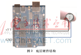 Arduino是一款便捷灵活、方便上手的开源电子原型平台。Arduino能够通过AD对传感器信号采样处理,并将数据通过串口发送至LabVIEW平台。其与脉搏心率检测模块一起构成了本设计的底层硬件。图2为底层硬件结构。
