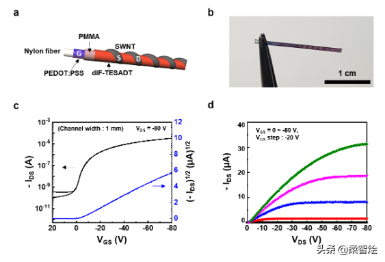 (a)装置结构示意图和(b)螺旋式CNT-场效应管 捏造的在柔软的尼龙超细纤维上。