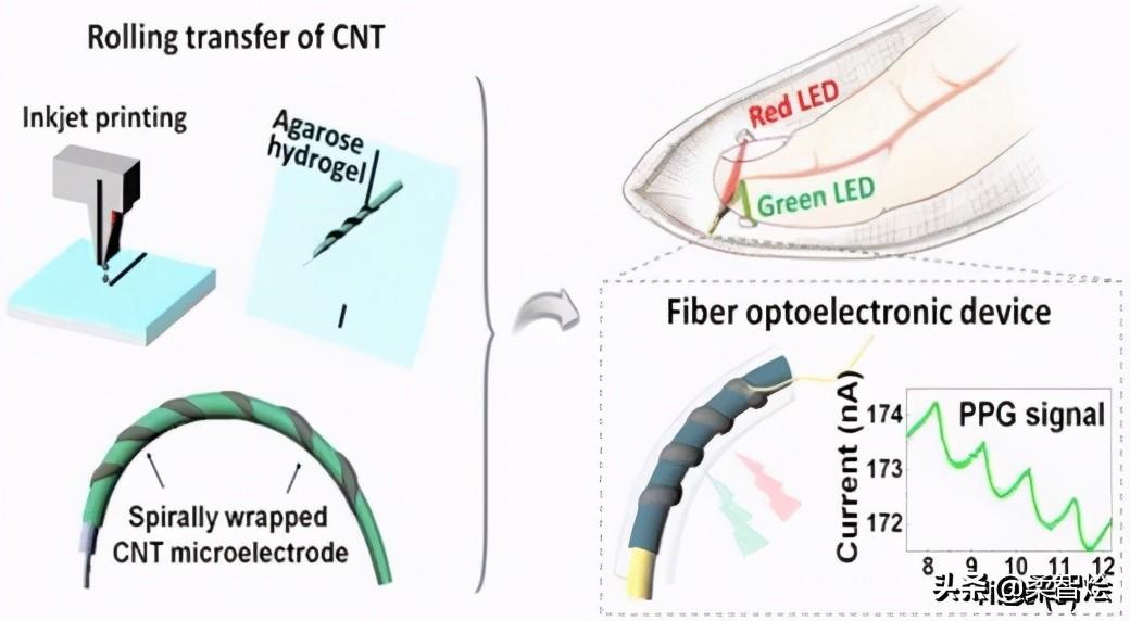 可穿戴设备的进步使电子纺织成为可能,这种纺织将轻巧舒适的纺织品与智能电子技术融合在一起,并作为下一代可穿戴技术而受到关注。尤其是,具有电子特性的纤维电子设备在保留纺织品的特定特性的同时,是制造电子纺织品的关键要素。光纤光学器件用螺旋包裹碳纳米管微电极,超越了几何限制,可应用于智能可穿戴电子纺织品应用。