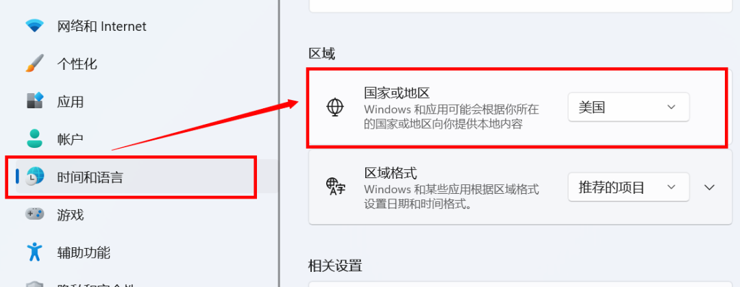 设置→时间和语言→国家或地区选择“美国”