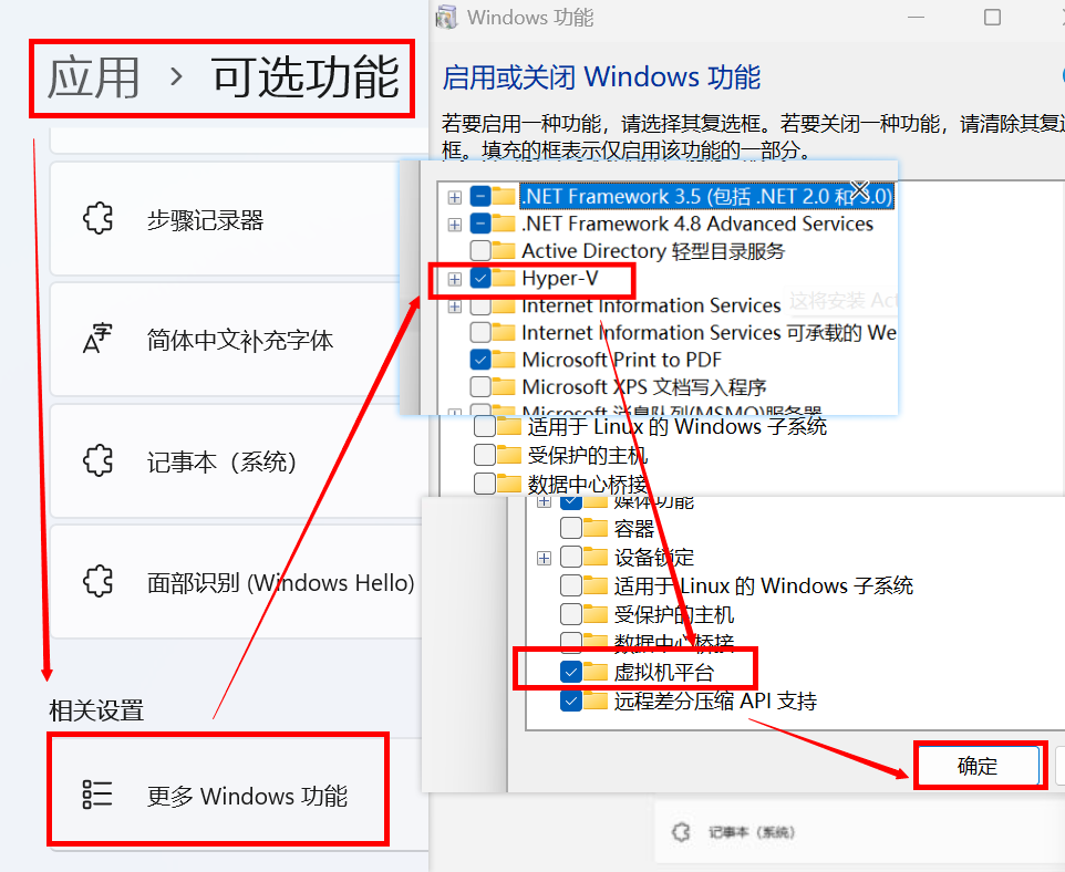 设置→应用→可选功能→更多Windows功能→并勾选开启「Hyper-V」和「虚拟机平台」→重启系统。