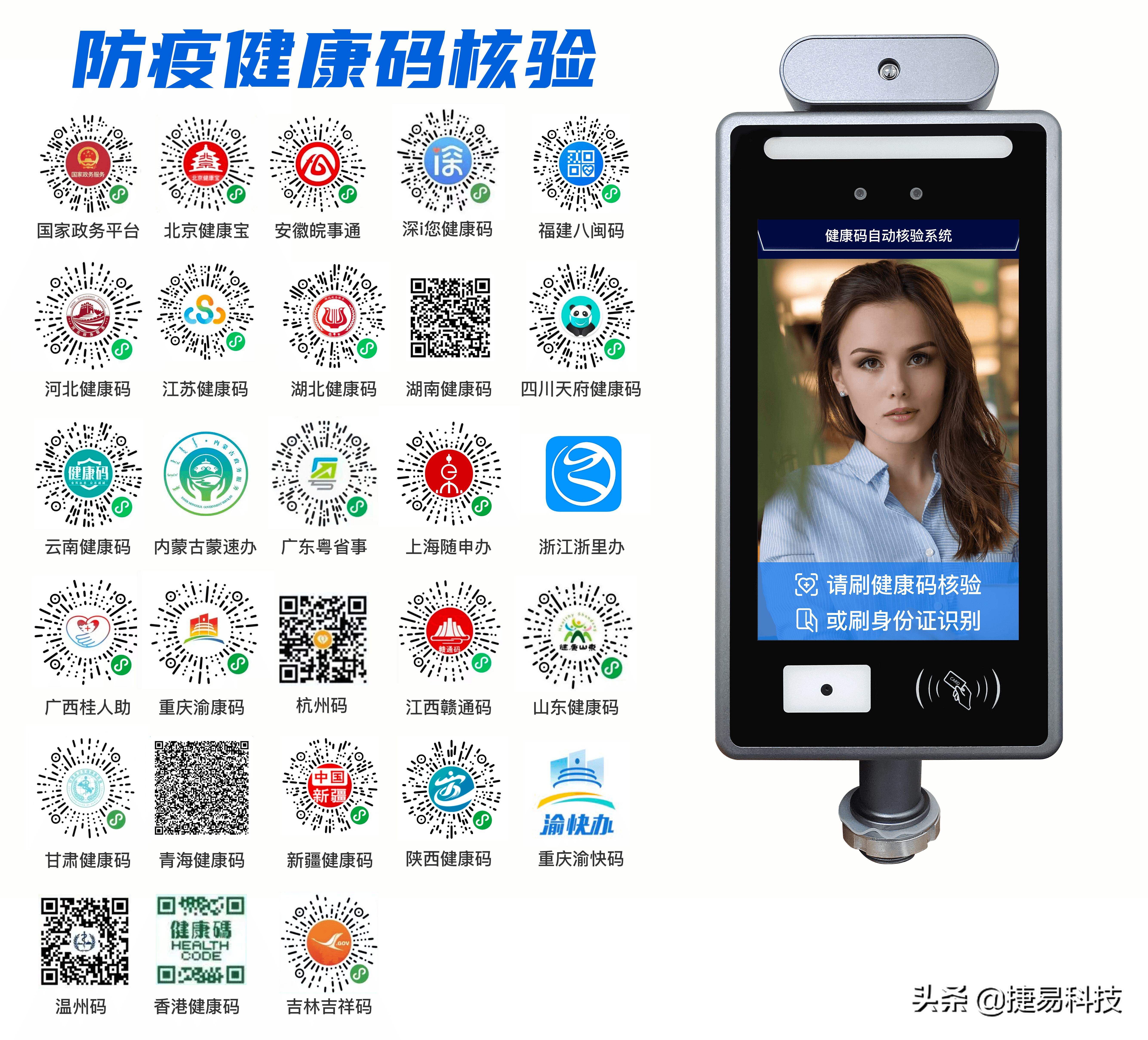 捷易科技已对绿色环保、智能化、平战结合的应急防疫体系和装备进行了较多的研发,如:2020年,针对人体精准测温的趋势,开发了测温型人脸识别一体机;2021年,针对居民出行亮码难等问题提出可移动、分布式、多样化的健康码核验终端。目前,捷易电子哨兵已经支持全国30多个地区的健康码平台以及核酸、疫苗平台。捷易科技电子哨兵解决了传统验码测温功能单一、智能化程度低等问题,作为应急防范保障设备,可迅速投入疫情防控工作中去。