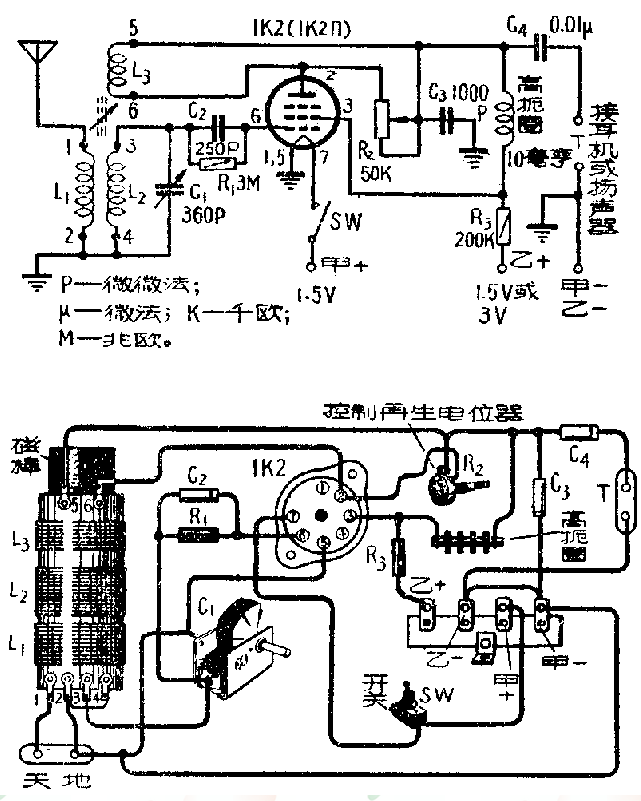 这部单管机线路如图所示。它的特点:(1)用电少,只需要乙电1.5~3伏,甲电1.5伏,就可以满意地收听。离电台近的地方,用1.5伏,耳机收听,就很满意了,用3伏就可以放扬声器。(2)灵敏度和选择性都很高,能收听国内很多电台。(3)由于采用了磁性天线,对天线的要求也不高,在离电台近的地方,只需用一、二米长的拖线搭在窗外就可收听了。(4)构造简单,零件容易购买,易于制作。(5)造价低,耗电少,使用经济。