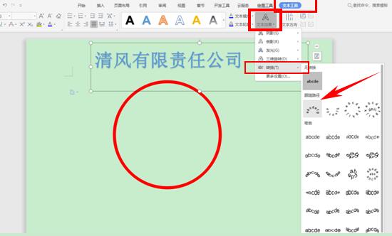 输入公司名称,比如“清风有限责任公司”,单击工具栏【文本工具】下的文本效果,选择下拉菜单中【转换】下的跟随路径: