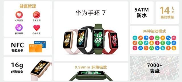 华为手环 7可选原野绿、烈焰红、曜石黑、星云粉4种配色,搭配增加细腻金属质感处理的增强型聚合纤维外壳;其支持96种运动模式,在典型场景下,它拥有能够长达14天的强劲续航。