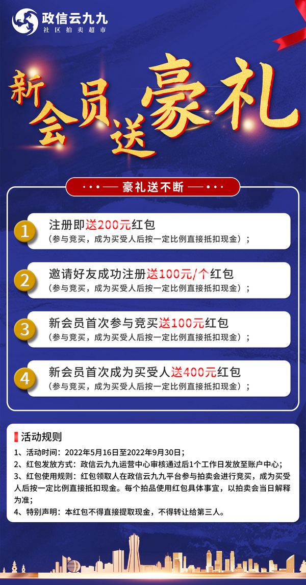 另外,“社区拍卖超市”—政信云九九还正在开展“新会员送豪礼”活动,欢迎社会各界朋友参与。