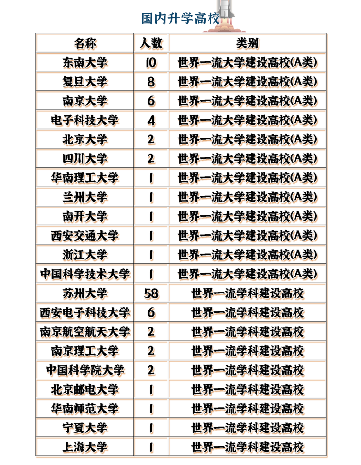 2021届电子信息学院有137人选择升学前往国内外名校深造,国内升学112人,全部进入“双一流”大学 攻读研究生,国外升学25人,23人进入QS排名前50的世界名校。