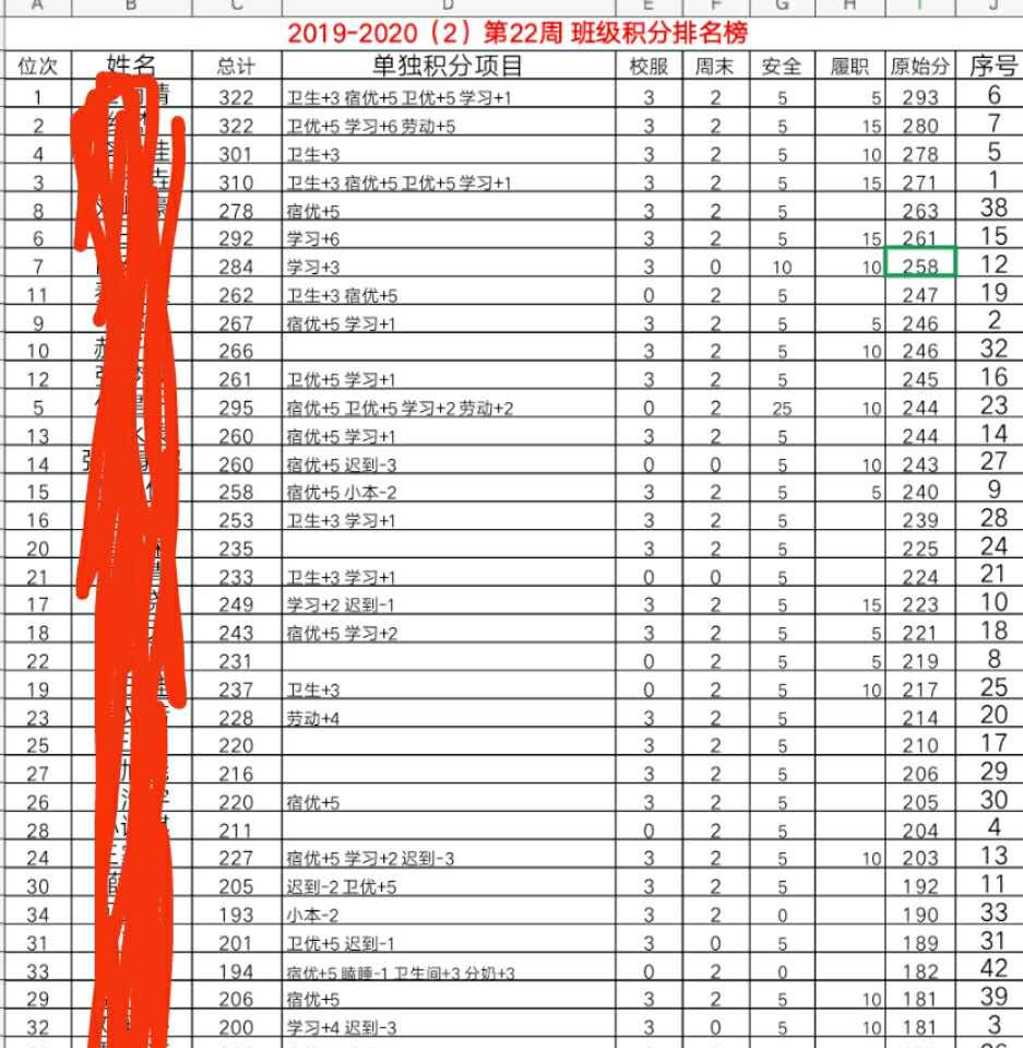 解析:这是2019-2020第二学期最后一周中考前的积分记录表,个人单独积分项目中的奖扣分都根据积分标准有记录,集体积分项目根据班级实际情况进行调整、执行。