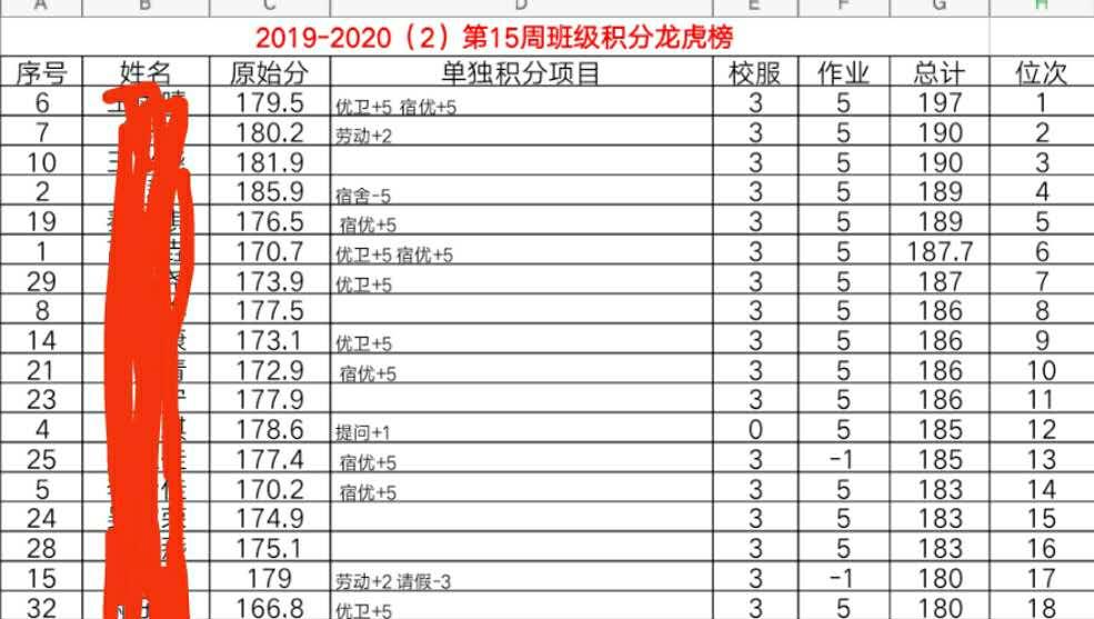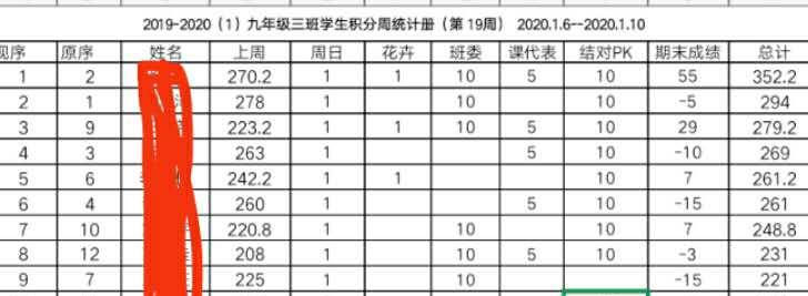 解析:这是2019-2020第一学期期末考试后的积分记录表,也就是本学期最终的积分排名榜。重点针对考试成绩和班委履职做的积分表。