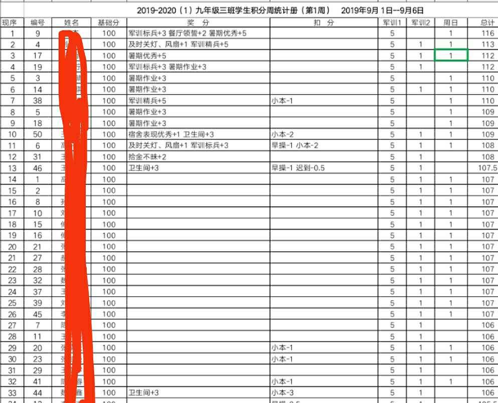 解析:这是2019年9月开学第一周班级积分记录表,表格看起来很简单,纵向是班级学生编号和姓名,横向除了“奖分”和“扣分”两列外,还会灵活地根据当周情况设置积分项目,如“军训1”中的5分是全程参加学校军训并代表班级参加军训汇演的奖励分数(当时积分标准规定的是班级拿到前三名,每位同学奖励5分,拿不到前三名每位同学奖励3分)军训2是表现突出学生额外奖励分数,“周日”指周日按规定到校在教室点名的奖励积分。