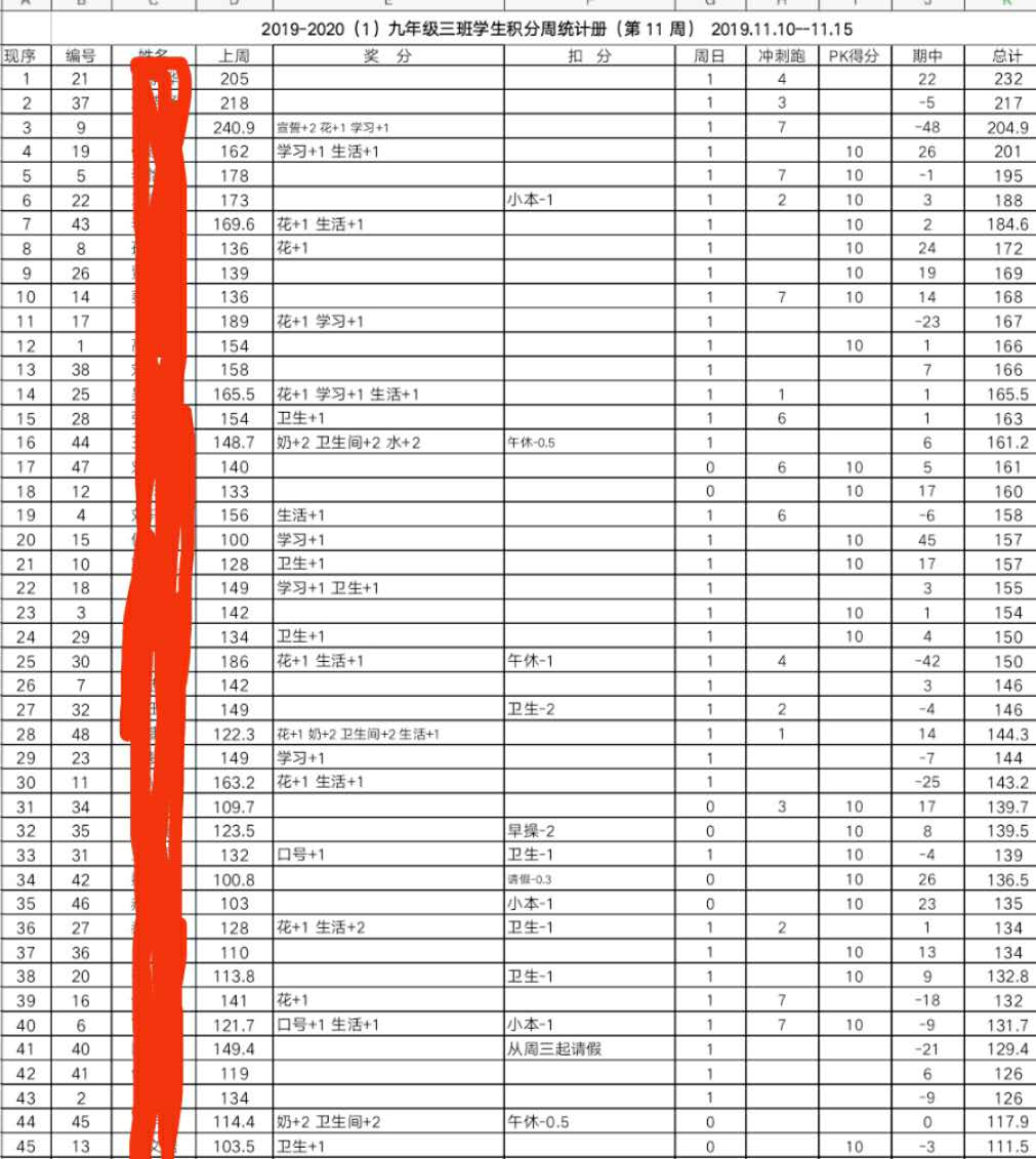 平时更多精力放在调整积分管理标准执行来引领班级发展和学生成长上,每周只需要拿出一节课来处理积分记录表。周一班会课时进行公布、分析和表扬鼓励就好了。