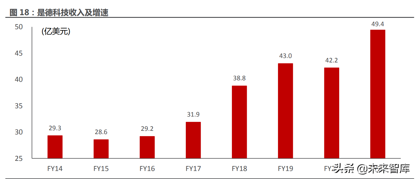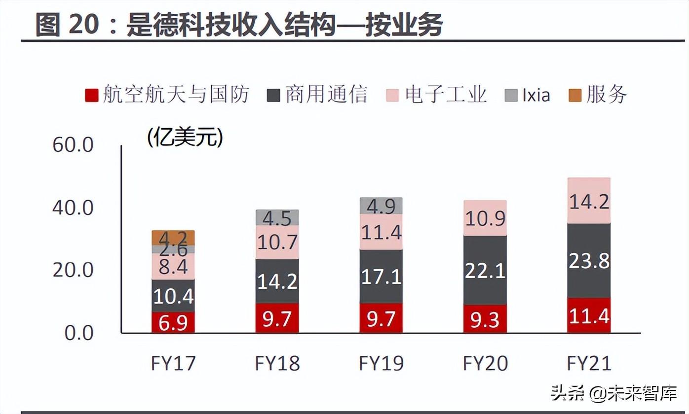 是德科技电子及工业制造业务收入在“后疫情时代”持续增长,前文逻辑得 以验证。FY4Q20,是德科技电子及工业制造业务收入实现 3.2 亿美元,同比增长 12.3%(FY3Q20 同比下降 14.9%),且保持增长态势,并于 FY3Q21 同比增长 47.8%,达到近 3 年最高增速。(报告来源:未来智库)