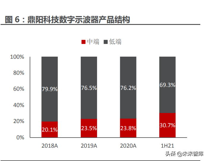 产品结构优化,不断推出更有竞争力的产品。 公司持续完善产品线,并推动 产品结构往更高档次发展。公司一方面对现有产品线进行纵向拓展,不断推出更 高档次的产品;另一方面在通用电子测试测量仪器领域进行横向拓宽,不断丰富 公司产品品类;同时根据市场需求变化对原有产品进行升级优化,不断推出综合 性能更好的新产品,逐步替代原有产品。上述措施,使得公司各档次产品营收均 呈增长态势,其中低端产品同比增长 24%,中端产品同比增长 33%,高端产品同 比增长 131%。