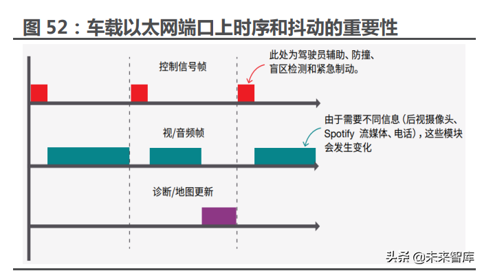 是德科技示波器能够进行硬件表征和微处理器接口验证,实现时间敏感网络 测试(TSN)。 TSN 通过单个标准以太网网络实现高输出电子控制单元(ECU)的实时控制和同步。车载系统中,一个端口可能会交换 150 到 200 个数据流。每个 流都有各自的优先级、紧急程度和应用数据。TSN 测试会将所有端口都连接到系 统上,检查整体情况,从而准确掌握网络的特性。通过在 Infiniium 示波器安装车 载以太网发射机一致性软件,能自动执行物理层电气测试,从而判断产品是否符 合电气与 IEEE 和 OPEN 联盟规定的传输一致性要求。