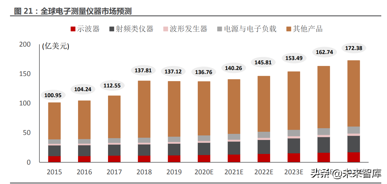 回到电子测量行业,尤其是数字测试领域,“内卷化”也较为明显。比如全球 示波器市场的总收入,根据弗若斯特沙利文统计预测,全球示波器市场 2020 年约 为 13 亿美元,过去 5 年 CAGR 3.0%,低于全球研发支出增速(2015 年-2020年 CAGR 3.5%)。