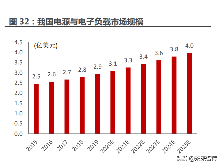 电源与电子负载在我国与全球的电子测量市场增长率相似。 2015 至 2020 期 间,全球电源与电子负载以 CAGR 4.5%从 2015 年的 8 亿美元增长至 2020 年的 9 亿美元,2025 年市场有望达到 12 亿美元,CAGR 5.0%。2015 年-2020 年, 我国电源与电子负载以 CAGR 4.7%从 2 亿美元增长至 3 亿美元,预计将在 2025 年达到 4 亿美元。
