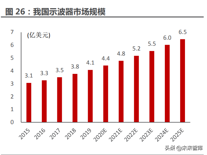 受益于政策的大力支持,智能制造、5G 商用化推广等下游产业的快速发展, 我国的电子测量仪器市场在近几年高速增长。 根据弗若斯特沙利文统计预测,2015至 2020 年间,我国电子测量仪器以 CAGR 12.8%从 26 亿美元扩张至 48 亿美元, 2020 至 2025 年间我国的电子测量仪器市场仍会继续扩张,但增长速率将会下降。 至 2025 年,预计我国电子测量仪器的市场将增长至 65 亿美元,CAGR 为 6.2%。