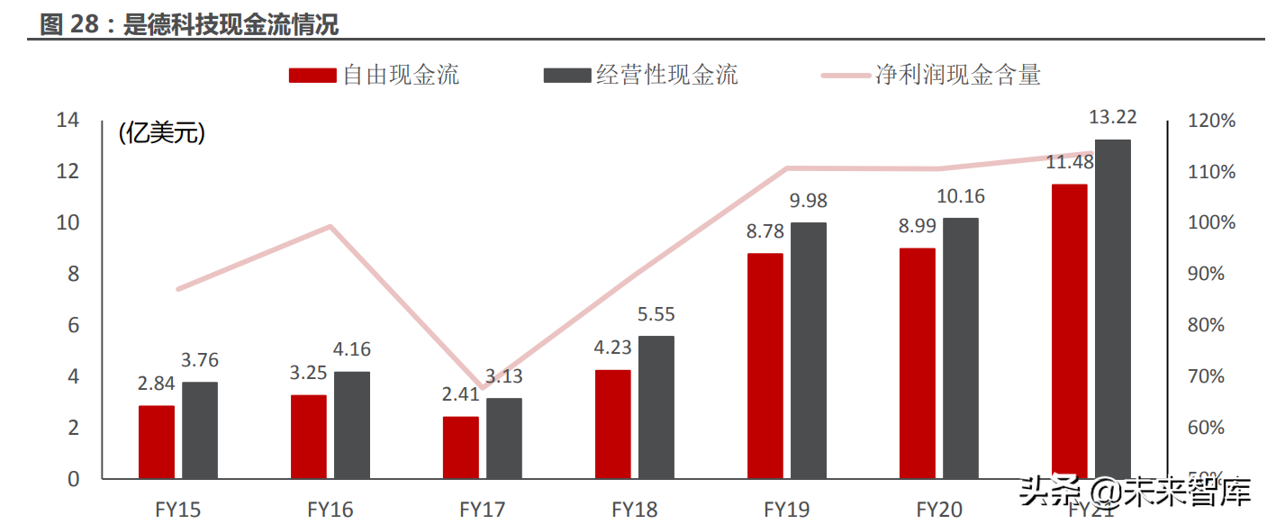 经营性现金流和自由现金流 FY15-FY21 CAGR 均超 20%,近三财年净利润 现金含量达 111%。是德科技 FY21 经营性现金流达 13.2 亿美元,同比增加 30%, FY15-FY21 经营性现金流 CAGR 23%;FY21 自由现金流达 11.5 亿美元,同比增加 28%,FY15-FY21 自由现金流 CAGR 26%。我们认为一方面由于是德科技高 毛利的业务结构调整改善了经营情况,“造血”能力提升;另一方面由于新冠疫情 对业务冲击逐渐减弱。FY17 净利润现金含量同比下降 31pct 至 68%,主要系收 购和火灾支出导致,FY18开始回转并逐渐增加,FY19-FY21始终处于111%以上。