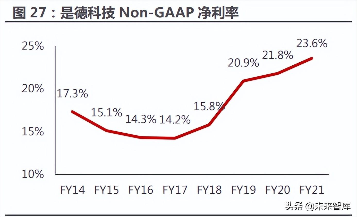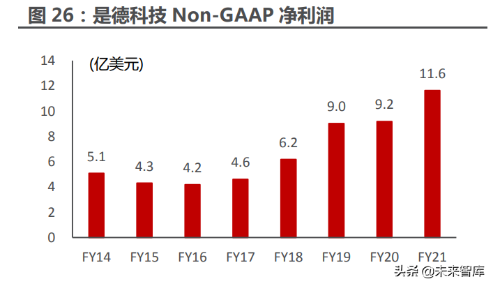多重利好因素促进净利润增长,净利率处于较高水平。是德科技 FY21 实现净 利润 11.6 亿美元,同比增长 27%,FY16-FY21 CAGR 13%,实现 5 年连续增长。 FY17,是德科技收购 Ixia,且加州火灾对本部造成严重损失,导致销售管理费用 上升,净利率下降至 14%。FY18 后,由于销售管理费用逐渐降低、成本稳定、 高毛利业务占比提高,净利率实现持续提升。