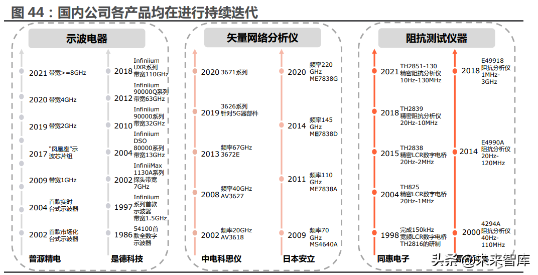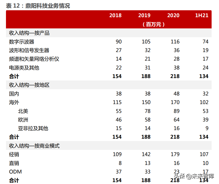 各厂商产品逐渐实现高端化突破,业务结构持续改善。 技术层面,国内厂商 产品线均处于迭代状态。普源精电自 2017 年推出“凤凰座”示波器专用芯片模组, 并基于该项技术于 2020 年,2021 年将数字示波器性能提升至最高 4GHz 带宽、 20GSa/s 实时采样率;最高 4GHz 带宽、20GSa/s 实时采样率。鼎阳科技于 2022 年 3 月发布了 26.5GHz 测量频率范围的高端矢量网络分析仪,标志鼎阳科技成为 国内主要竞争对手中唯一一个同时拥有行业四大主力产品(数字示波器、信号发 生器、频谱分析仪和矢量网络分析仪)且四大主力产品全线进入高端领域的厂商。