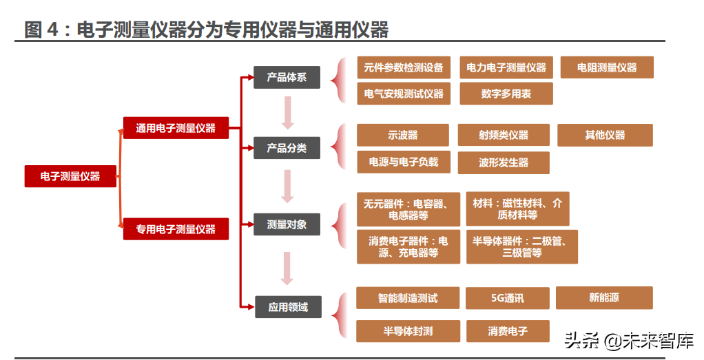 电子测量是产业链信息化、自动化、标准化的重要基础。 电子测量仪器在电 子信息各个产业链中都起到了不可替代的作用。从传统产业链角度出发,电子测 量仪器位于中游,上游主要为 IC 芯片、PCB 加工等原材料供应、制造厂商。下游 为高校、国防军工研究所、制造业等。