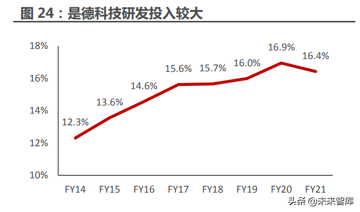 60%收入来自下游产品研发环节测试,研发高投入是公司增长的保障。我们 认为全球研发支出保持增长态势为是德科技业务增长提供良好土壤,根据公司公 告,是德科技约 60%收入来自于下游产品研发环节测试。我们认为,下游行业的 研发支出较资本开支具备更好的稳定性与更高的增速,是德科技在全行业中具备 更全的产品矩阵与研发环节协同测试能力,能够不断把握技术迭代趋势。