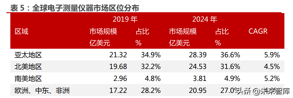 北美和亚洲仍是全球电子测量仪器最大市场。 根据 Technavio 统计,2019 年 全球电子测量仪器销售额中,亚太地区占比 34.9%,北美地区占比 32.2%。我们 认为一方面由于北美地区以美国为代表的国家工业基础深厚,且拥有是德科技、 泰克等优秀电子测量厂商,产业链完备;另一方面,亚太地区工业发展迅速,如 我国、日本、印度等国家正采取措施推动各产业在这些国家建立制造和研发基地, 其中,我国已成为全球的电子产品制造大基地,亚太地区电子测量仪器的市场需 求将呈现较快增长的趋势。Technavio 预测 2024 年亚太地区电子测量市场比重将 较 2019 年提升 1.7pct 至 36.6%,CAGR 5.9%。