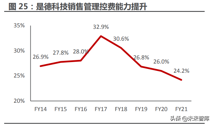 销售管理费用率呈先增后减趋势。2017 年 4 月,是德科技完成对 Ixia 收购, 收购相关资产的摊销增加、收购和整合成本、补偿成本上升;同年 10 月,加州北 部森林大火对位于圣罗莎的公司本部造成严重损失,综合导致 2017 年销售管理费 用同比上升至 28%,销售管理费用率达 33%。FY18 开始,随着收购相关余额的 摊销、保修成本下降,以及疫情导致的差旅、营销等相关成本下降,销售管理费 用率持续下降,彰显公司控费能力。
