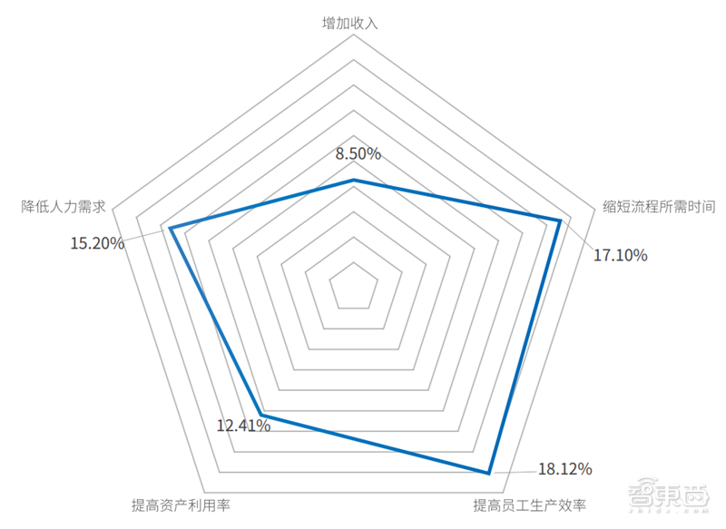 其次,通过与大数据、云计算、5G 等 ICT 技术的融合,推动着各行各业智能化技术的优化与创新。根据 IDC 针对企业应用人工智能及算力现状调研发现,目前企业已经从 AI 的应用当中获得显著的正向反馈。整体而言,企业已经可以从部署中获益,实现收入增加,调研显示被访企业借助 AI 可平均增加 9.8%的收入(尤其在互联网、交通、制造、医疗、电信等领域的收入增长较为明显),平均缩短 20.4% 的流程时间,提升21.6% 的生产效率。