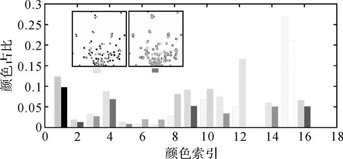 本方法中提及的颜色均是在RGB色彩空间下,颜色量化方法采用最小方差法,可以指定保留的颜色数量。基于量化后的颜色集合,分别统计每种颜色在两张瓦片中的出现频率,得到色彩直方图,最后利用余弦距离计算直方图之间的相似程度。图 5中展示了两张瓦片在颜色量为16时的直方图,此时相似度为0.172。颜色量会影响相似度的结果。笔者尝试多次后发现当颜色量多于地图中实际出现的颜色后,相似度逐渐趋于稳定,因此,后文试验设定了一个相对较高的颜色量。另外,专题地图中往往会包含大面积的空白区域或底色填充(如图 5中两张瓦片),这些区域也会被识别为连续色块并具有较大影响力,进而干扰相似度计算。本方法在相似度计算时作了简单调整,将直方图中占比最大的颜色权重置零,忽视其对相似度的影响。