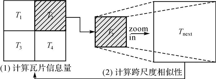 算法从L0级开始依次遍历所有缩放比例,每个缩放比例包括两次计算。如图 2所示,首先计算瓦片信息量,获取当前缩放比例下内容最丰富的瓦片T2;然后获取与T2相同地理范围的下一级瓦片Tnext,并计算T2和Tnext的相似度,如果相似度大于阈值,就选取Tnext作为缩略图。Tnext是处理下一个缩放比例的初始瓦片,将其等分为4张瓦片,然后重复上述计算过程。完成所有缩放比例的计算后,缩略图集合生成完毕。