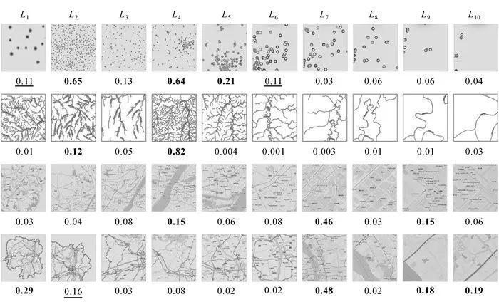 图 7 各个缩放比例的代表性地图瓦片及跨比例尺相似度(字体加粗表示正确的缩略图候选,下划线表示算法误判)Fig. 7 Map services' representative map tile at each scale and trans-scale similarity (bold font represents correct thumbnail candidates and underline represents misjudgments of the algorithm
