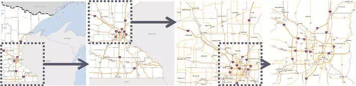(2) 堪萨斯州河流等级图。该服务最明显的突变在L4,由于大量低等级河流的出现,地图呈现出与上个缩放比例完全不一样的外观。另一个相对较弱的突变是L2中的河流标明了注记。该服务缩略图集合为L0、L2和L4,算法结果准确。