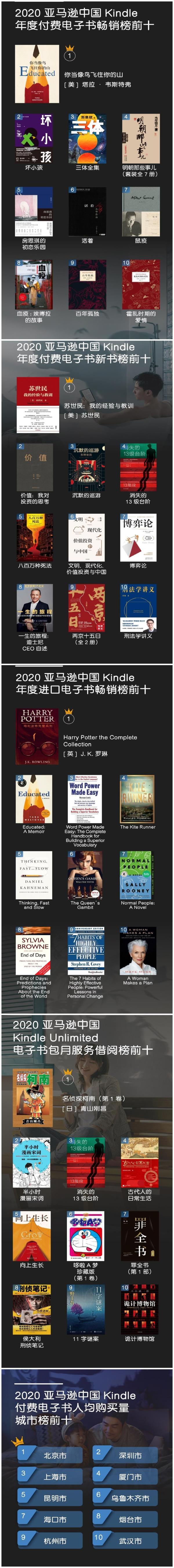 12月30日,亚马逊中国发布2020年度Kindle阅读榜单,盘点数字阅读趋势与阅读行为特征。《你当像鸟飞往你的山》《坏小孩》和《三体全集》分列Kindle年度付费电子书畅销榜前三位。《苏世民:我的经验与教训》《价值:我对投资的思考》和《沉默的巡游》成为付费电子书新书榜前三名。北京、上海、深圳再度成为年度Kindle电子书消费总量及人均购买Kindle电子书数量最多的三座城市。
