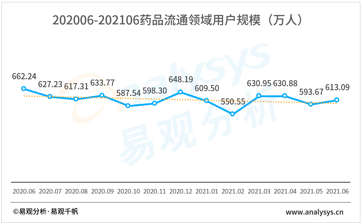 根据易观千帆数据显示,医药电商领域6月活跃人数为613.09万,在“618购物节”的提振下环比上涨3.27%,相较去年同期的662.24万同比下降7.4%,但与2019年同期相比,依然增长64.4%。